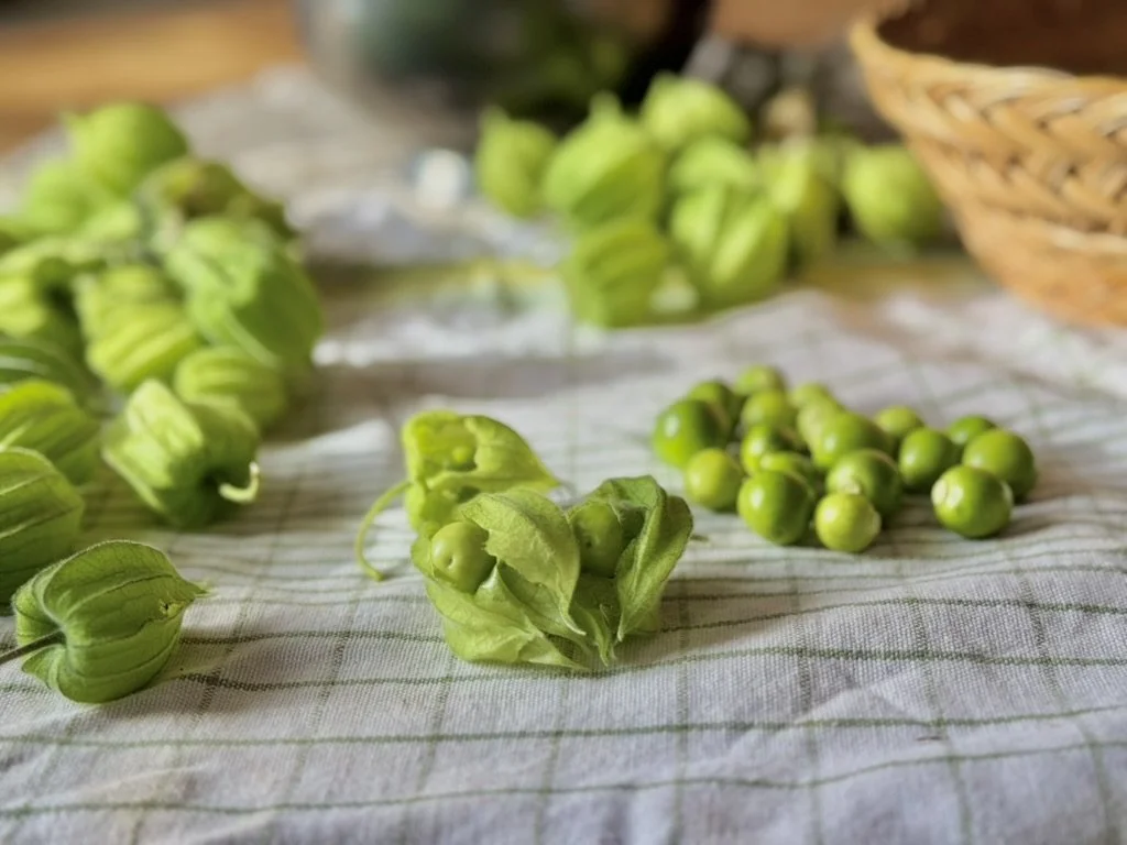 Tomatillos naturally come wrapped in these thin, lantern-like shells, which dry as the fruit matures. Once peeled, the berries may feel slightly sticky — that’s normal. Give them a quick rinse before using.